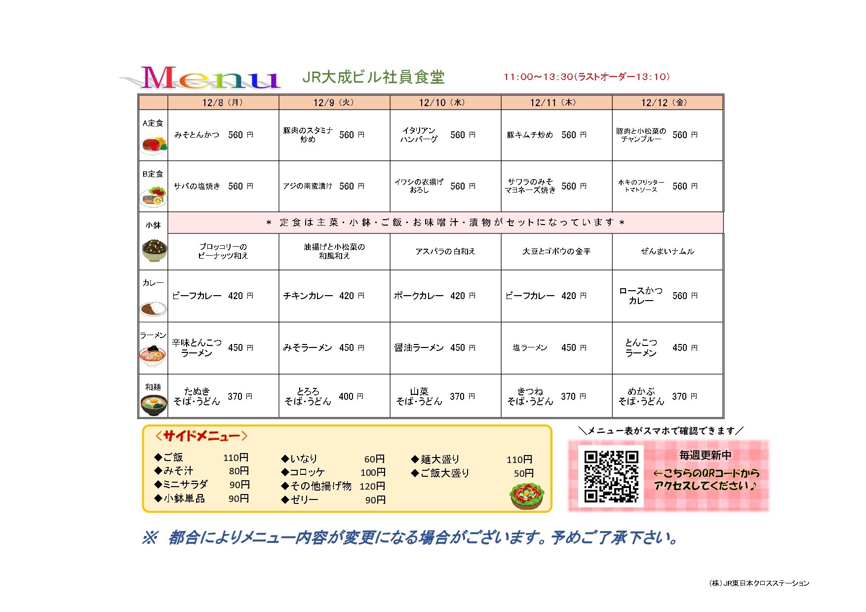 JR大成ビル社員食堂~今週の献立~