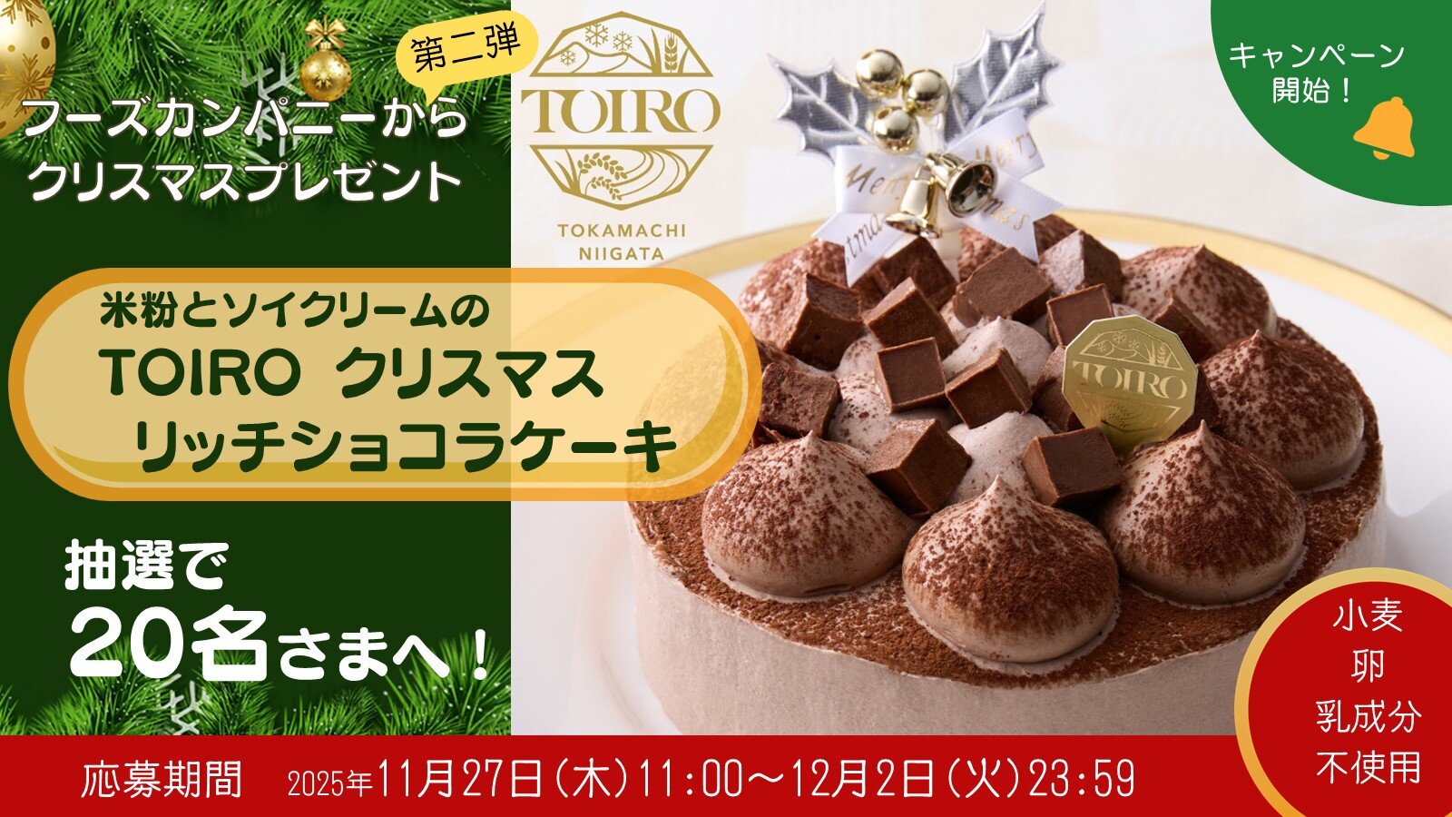 十日町すこやかファクトリー「TOIRO クリスマスリッチショコラケーキ」が20名に当たる